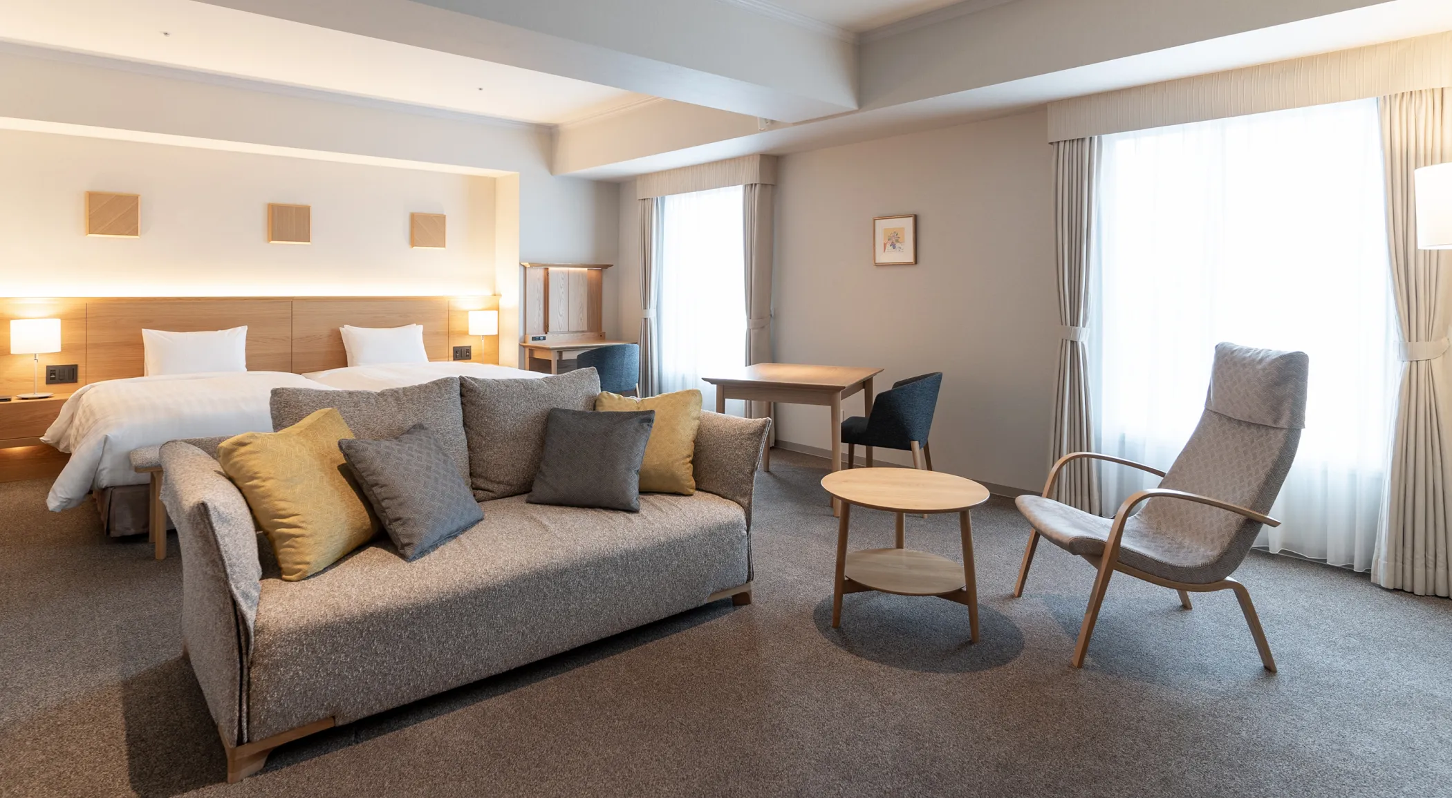 2023年にリニューアル誕生した客室「オーセントスイート」は、北の大地で成長した北海道産木材を活用しました。シンプルなデザインの中にあたたかみのある客室で開放的な滞在をどうぞ。