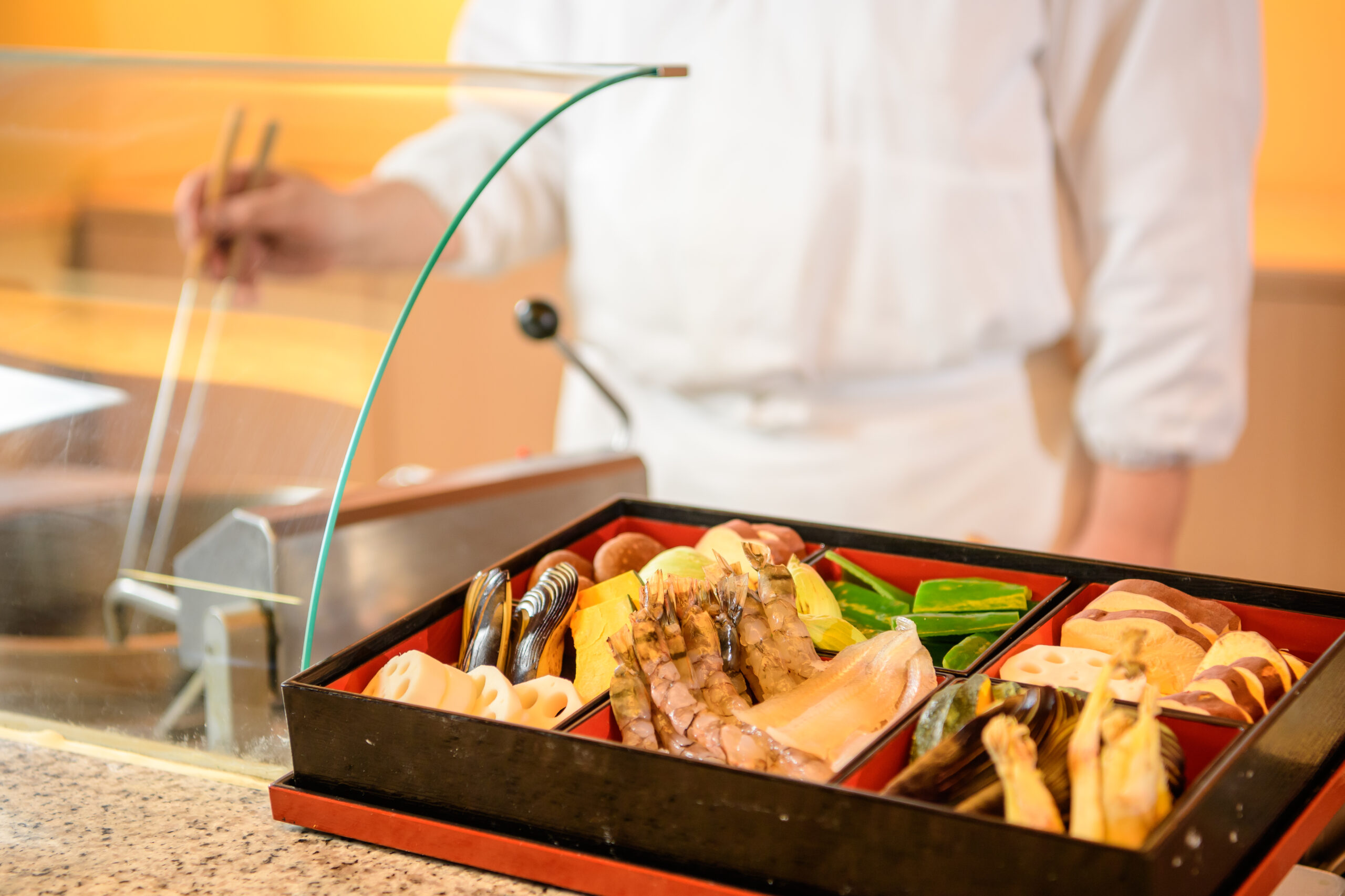 柜台的座位可以享受厨师在您面前烹饪的奢华用餐体验。也提供个人的包间。