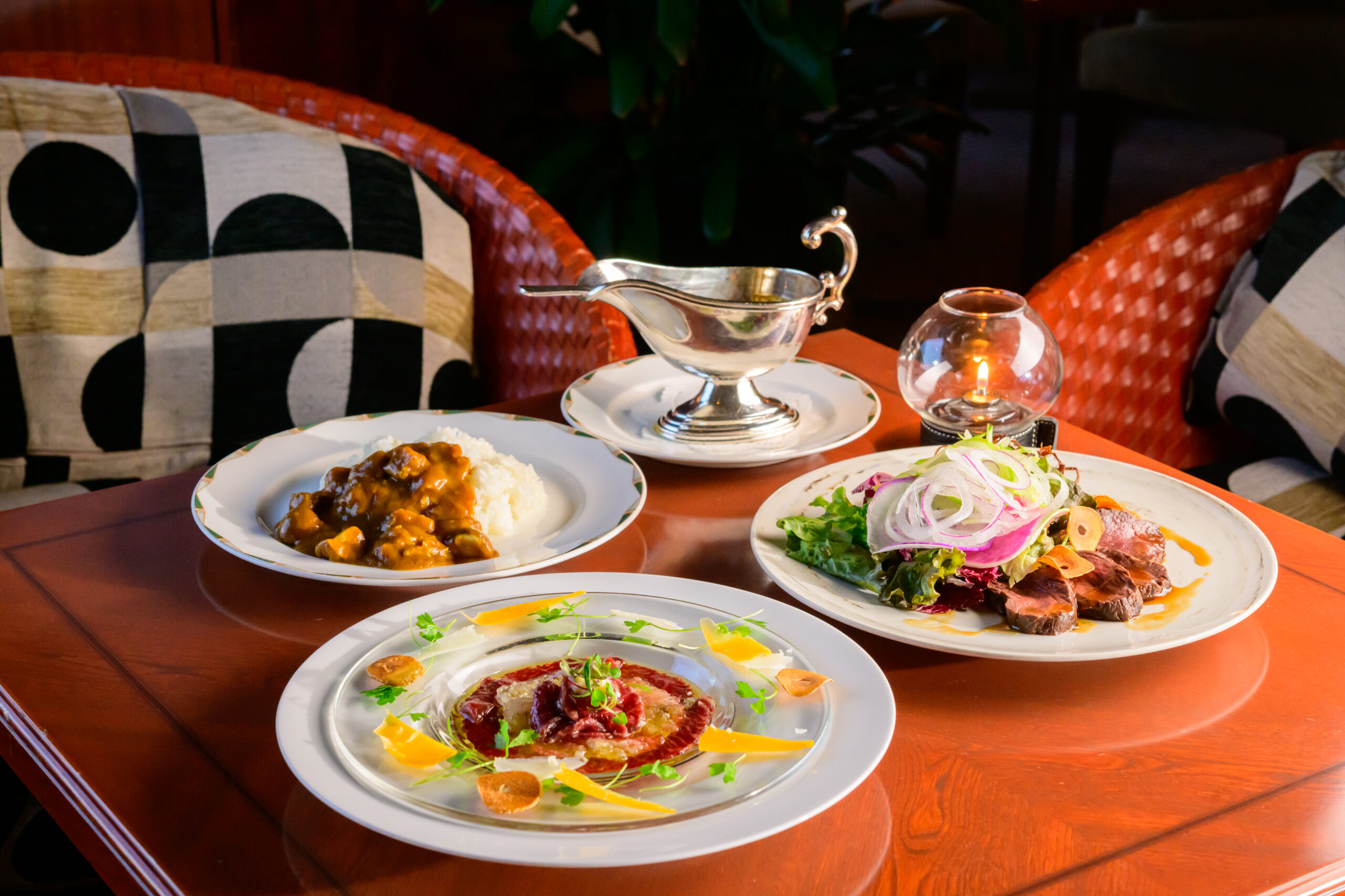 芳醇なスパイスが鯨肉の旨みを引き立てる「鯨タンカレー」、希少部位を堪能する「ナガス鯨 尾の身とおばいけのカルパッチョ」、香り高く仕上げた「ナガス鯨 赤身のローストサラダ仕立て」と、3種の趣向を凝らしたメニューをラインアップ。会席料理とはまた異なるスタイルで、鯨の奥深い魅力をご堪能いただけます。